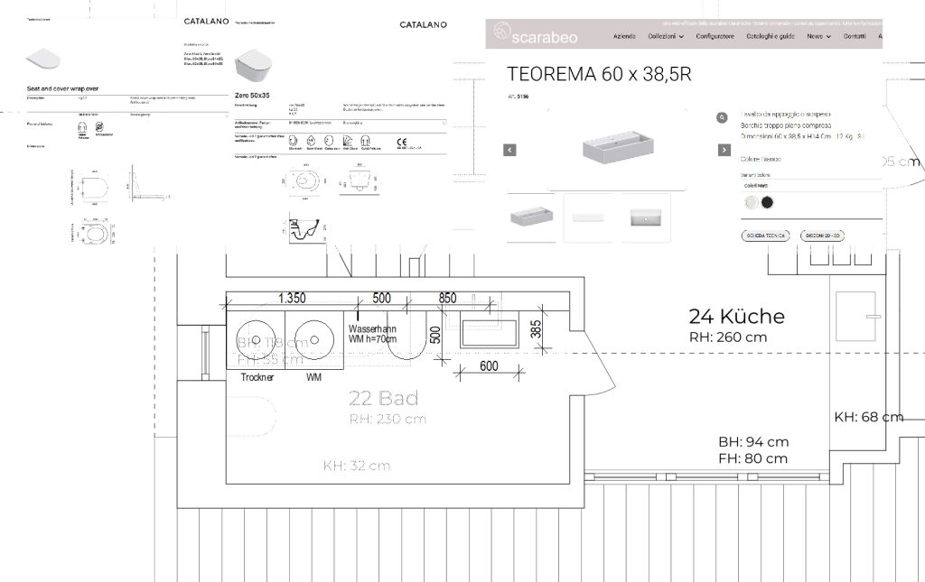 nachstehend und anbei mein Vorschlag für die Anordnung von Trockner, Waschmaschine, WC und Waschbecken. Ich würde mit dem Waschbecken beginnen, es muss ein wenig tiefes Waschbecken sein, konkret das Scarabeo Teorema 60 x 38,5 cm. Wenn das Waschbecken zu tief wird, wird das Stehen vor dem Waschbecken wegen der geringen Raumhöhe unbequem, vor dem Waschbecken steht man aber im Allgemeinen gerne. Auch das anschließende WC würde ich mit Blick auf die Raumgeometrie etwas weniger tief als die Standardtiefe von 53-56 cm wählen, ausgesucht habe ich das Catalano Zero mit einer Tiefe von 50 cm. Ganz wichtig ist der dazugehörige umhüllende Sitz. Für Waschbecken, WC und Sitz habe ich jeweils die Technischen Daten und die Artikelnummern in die Zeichnung gesetzt. Damit die Waschmaschine direkt an der Vorwand – die ich 18cm tief eingezeichnet habe – positioniert werden kann, könnte der Wasserzulauf in einer Höhe von etwa 70 cm über Fertigfußboden mit einem Abstand von 135 cm zur Fensterwand angeordnet werden. Es bleibt dann ausreichend Platz für eine Anordnung von Waschmaschine neben dem Wasserauslauf und dem Trockner in der Ecke. Trockner Waschmaschine und Wasserauslauf könnte man hinter einem Schrank / hinter einem Regal / unter einer Platte verstecken.