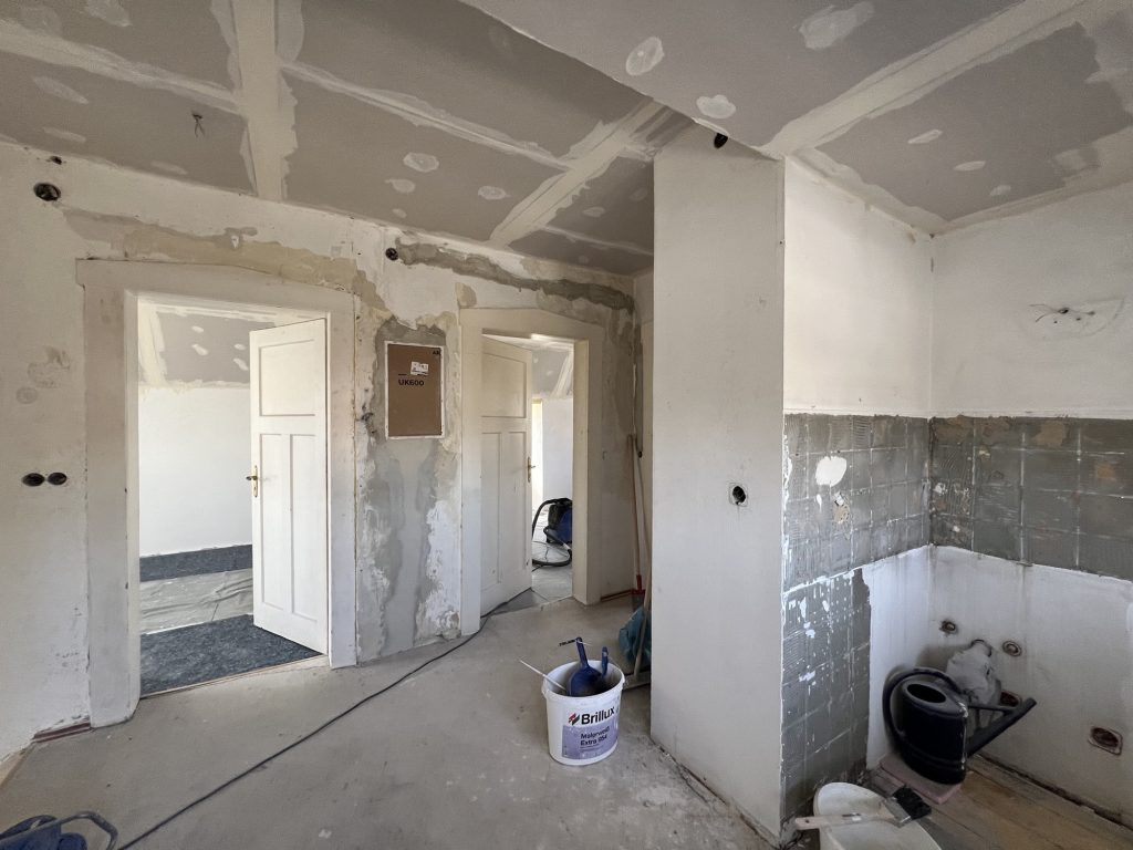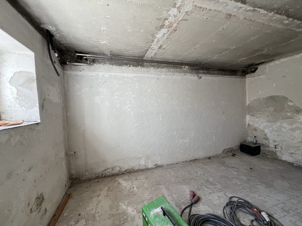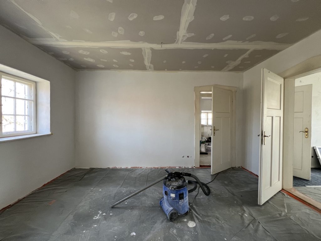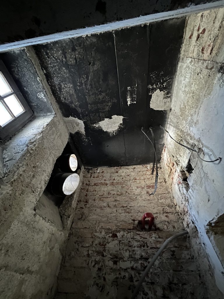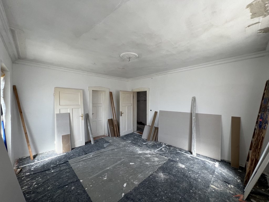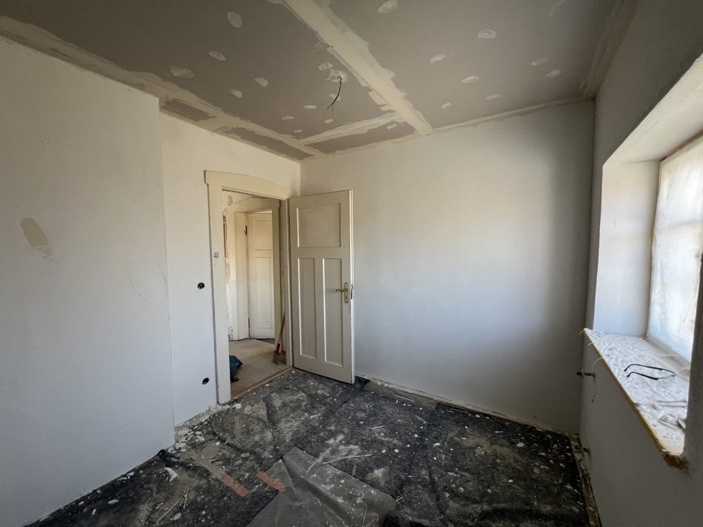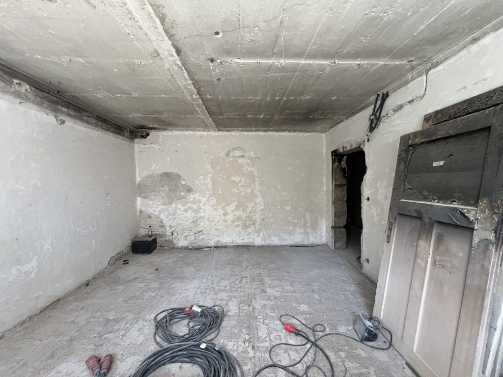 – MBS – finale chemische und manuelle Reinigungen sämtlicher Rußstellen an Wänden, Decken, Türrahmen im 1. OG, EG und Keller