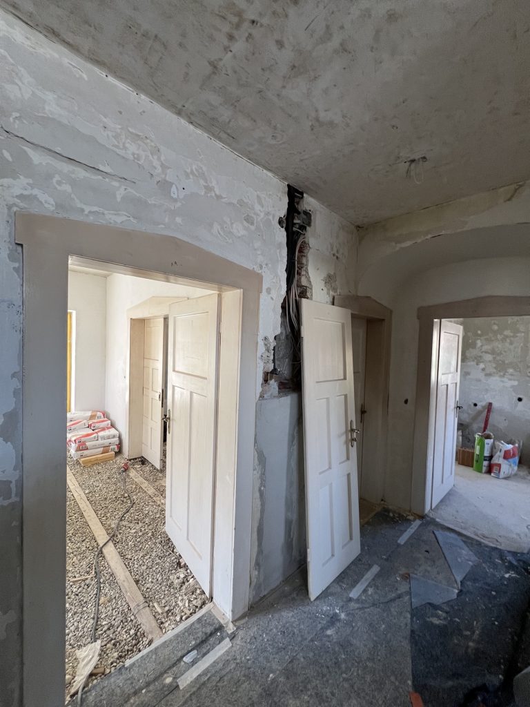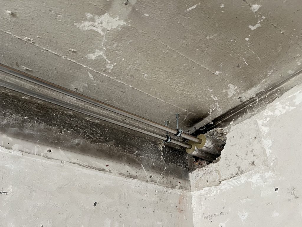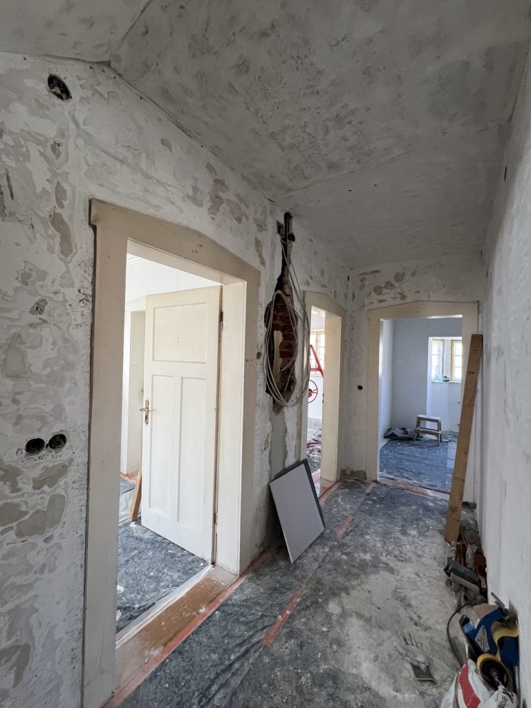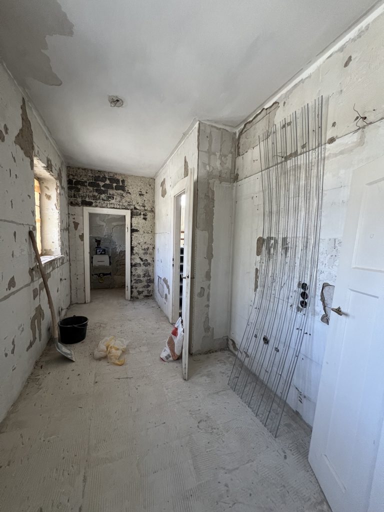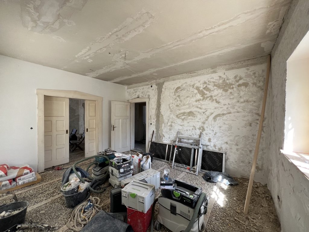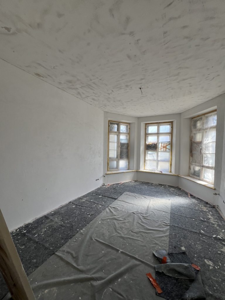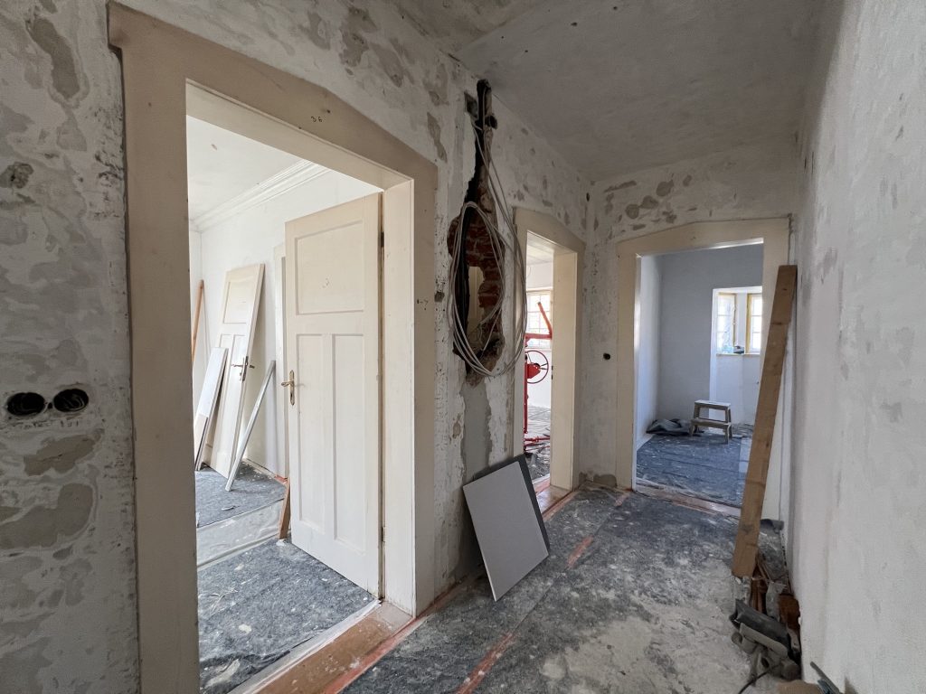 – MBS – finale chemische und manuelle Reinigungen sämtlicher Rußstellen an Wänden, Decken, Türrahmen im 1. OG, EG und Keller