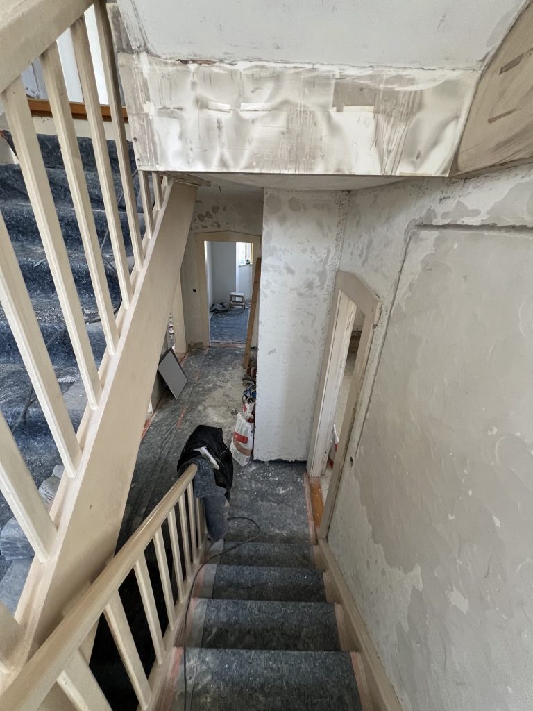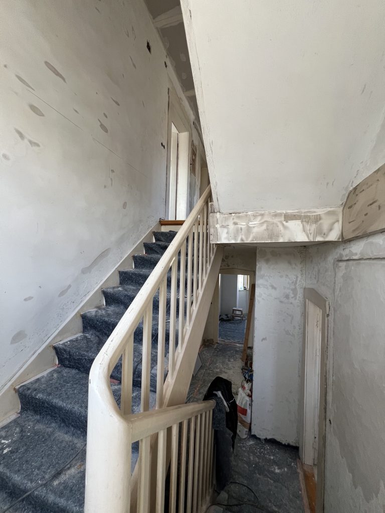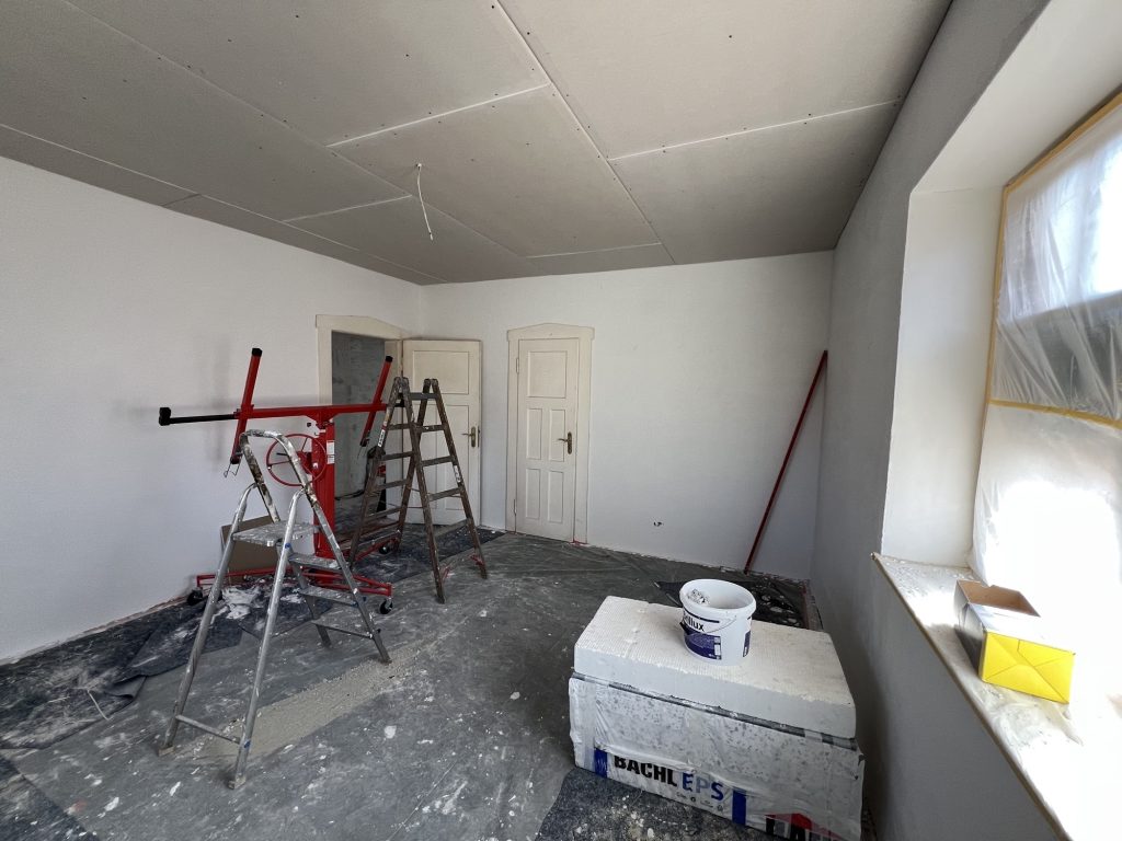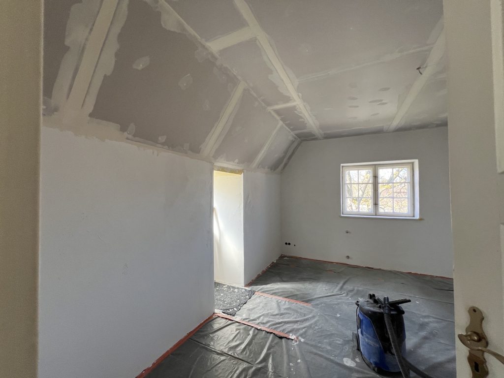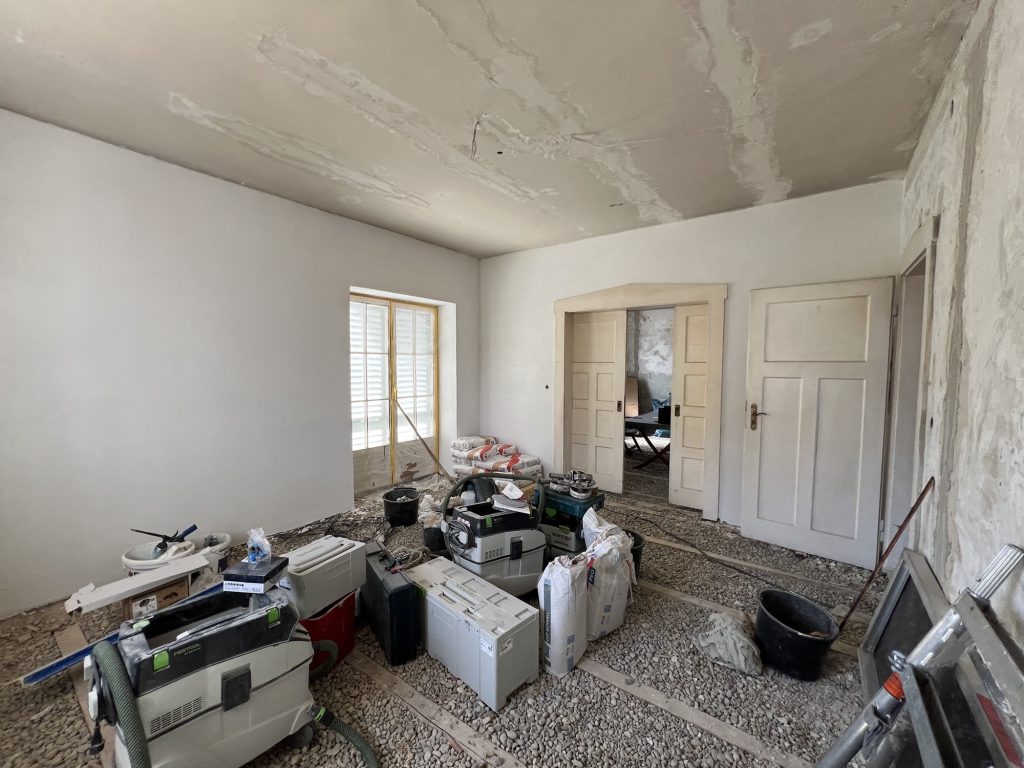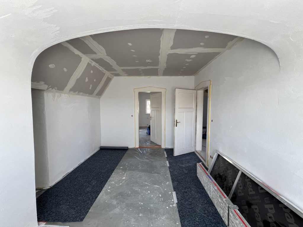 – MBS – finale chemische und manuelle Reinigungen sämtlicher Rußstellen an Wänden, Decken, Türrahmen im 1. OG, EG und Keller